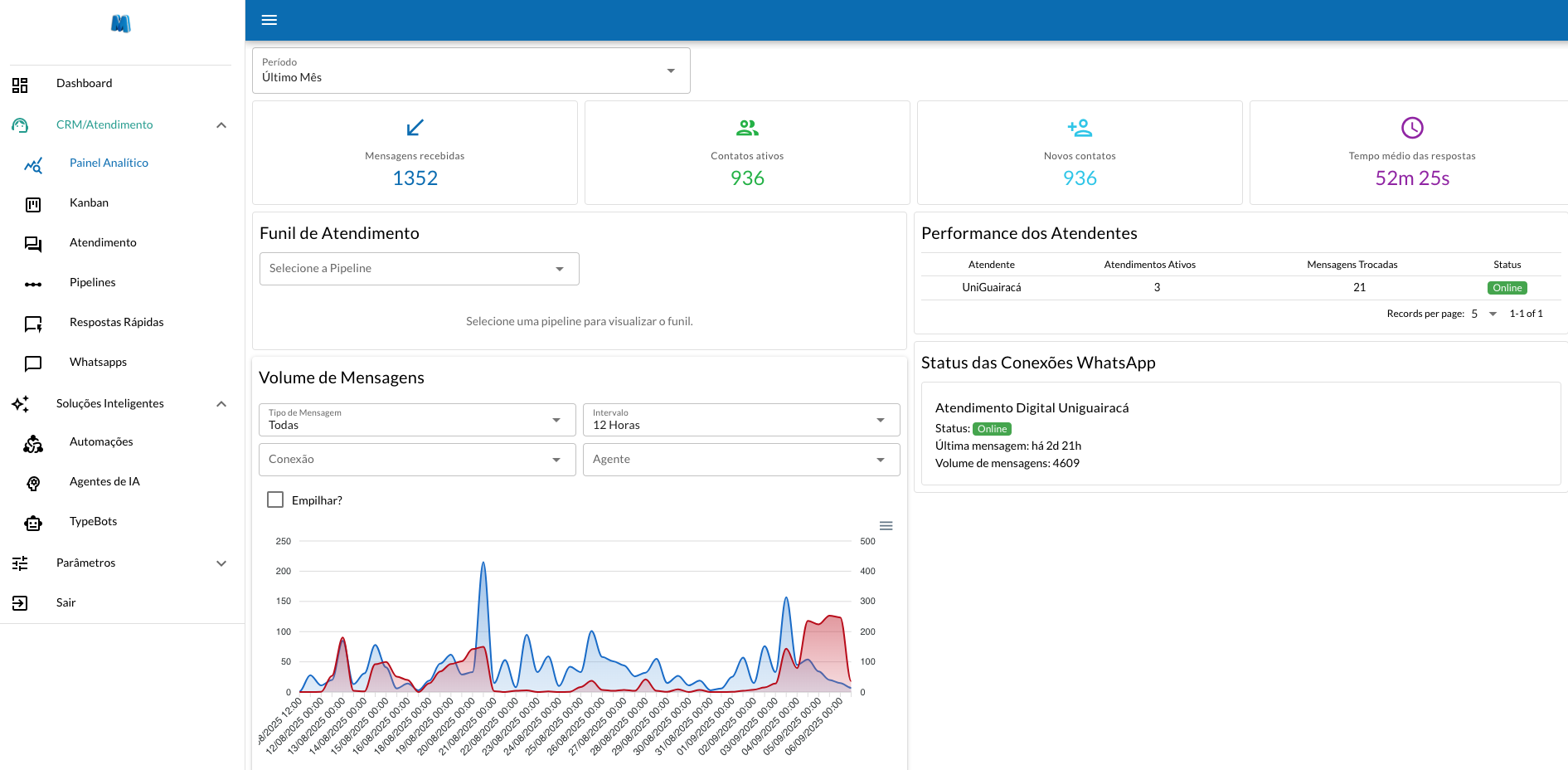 Outro ponto de destaque é o uso do chatbot, que nos permite oferecer um atendimento preliminar já na etapa inicial da comunicação. Assim, o próprio cliente pode indicar previamente o assunto sobre o qual deseja tratar, otimizando o fluxo interno e permitindo que o atendimento seja encaminhado ao setor mais adequado desde o início.