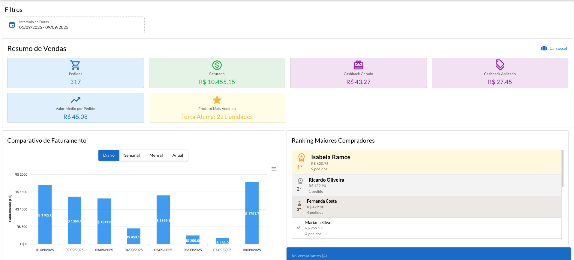 A Mensagio contribuiu exatamente com isso. Hoje temos controle detalhado de estoque, entradas e saídas, fluxo de caixa, vendas recebidas e a receber, além de relatórios de faturamento que nos permitem comparar períodos e enxergar nossa evolução de forma clara.